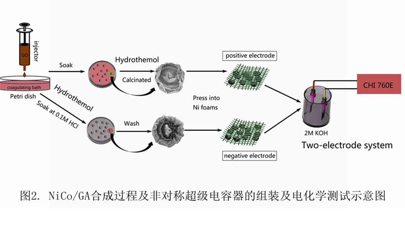 该方法具有一定的普适性,通过使用不同种类的凝固浴,例如酸性溶液(HCl)、碱性溶液(NaOH)、中性盐溶液(NaCl)等,均可制备得水凝胶,同时借助一定浓度的过渡金属盐溶液(Co(NO3)2、Ni(NO3)2等),并经过一定的后处理,可实现金属氧化物与石墨烯的三维复合气凝胶。该类气凝胶在储能、催化、传感器领域具有极大的应用潜力。例如在该工作中,成功合成镍钴双氧化物/石墨烯气凝胶,简称:NiCo/GA,并组装成超级电容器深入研究其赝电容性能。基于NiCo/GA与pure GA的非对称超级电容器,具有优异的性能,在功率密度为804.5和4500 W/kg的条件下,能量密度可达到24.6和21 Wh/kg,在经过5000次循环测试后,性能不减反而有20%的提升。该研究工作具体内容发表在ACS Applied Materials & Interfaces (ACS AMI, IF=7.504),题为“Fabricating 3D macroscopic graphene-based architectures with outstanding flexibility by novel liquid drop/colloid flocculation approach for energy storage applications”。论文第一作者为www.365388.com硕士研究生韩蒙同学,通讯作者为www.365388.com徐朝和研究员、胡宁教授以及新加坡南洋理工大学Lee Jong-Min教授。
